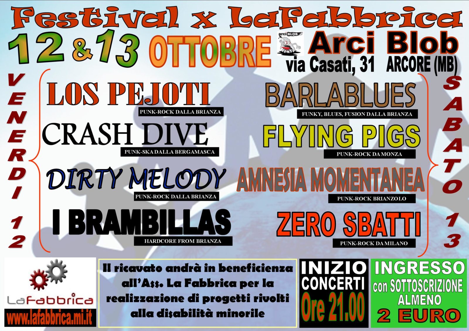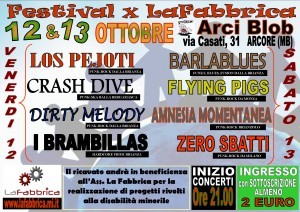 Venerdì 12 e sabato 13 ottobre sarà la volta di una due giorni di festival presso il circolo Arci Blob di Arcore (via Casati, 31) dove si esibiranno ben otto gruppi proponendo generi musicali diversi.