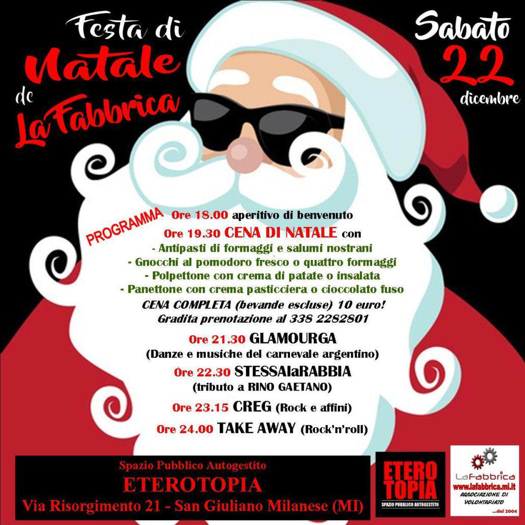 L’Associazione di Volontariato La Fabbrica in collaborazione con lo spazio Eterotopia vi invita sabato 22 dicembre alla FESTA DI NATALE 2018. Un pomeriggio e serata in buona compagnia gustando ottime pietanze, ascoltando buona musica e scambiandoci gli auguri dopo un anno di tante iniziative dedicate a tutti voi.