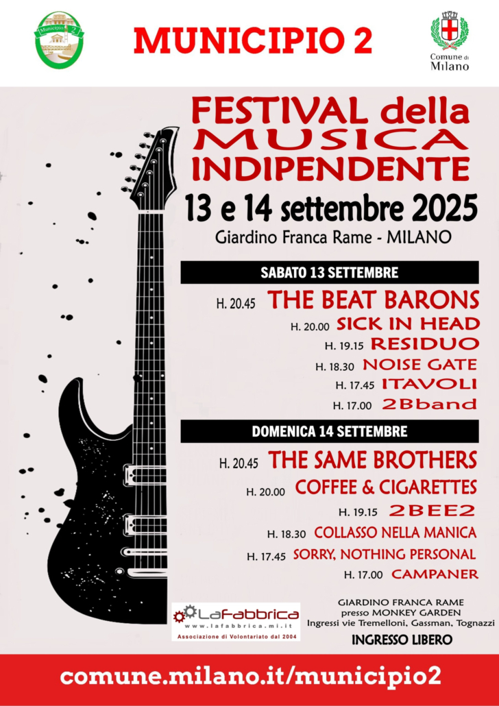 L’Organizzazione di Volontariato La Fabbrica con il prezioso contributo e collaborazione del Municipio 2 del Comune di Milano presenta il FESTIVAL DELLA MUSICA INDIPENDENTE 2025, ovvero due giornate presso il prestigioso Giardino Franca Rame (quartiere Adriano presso Monkey Garden) con concerti e spettacoli dedicati alla promozione artistica e musicale del territorio.